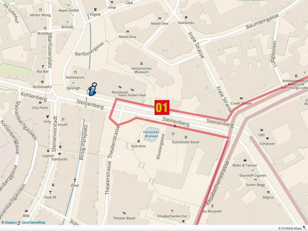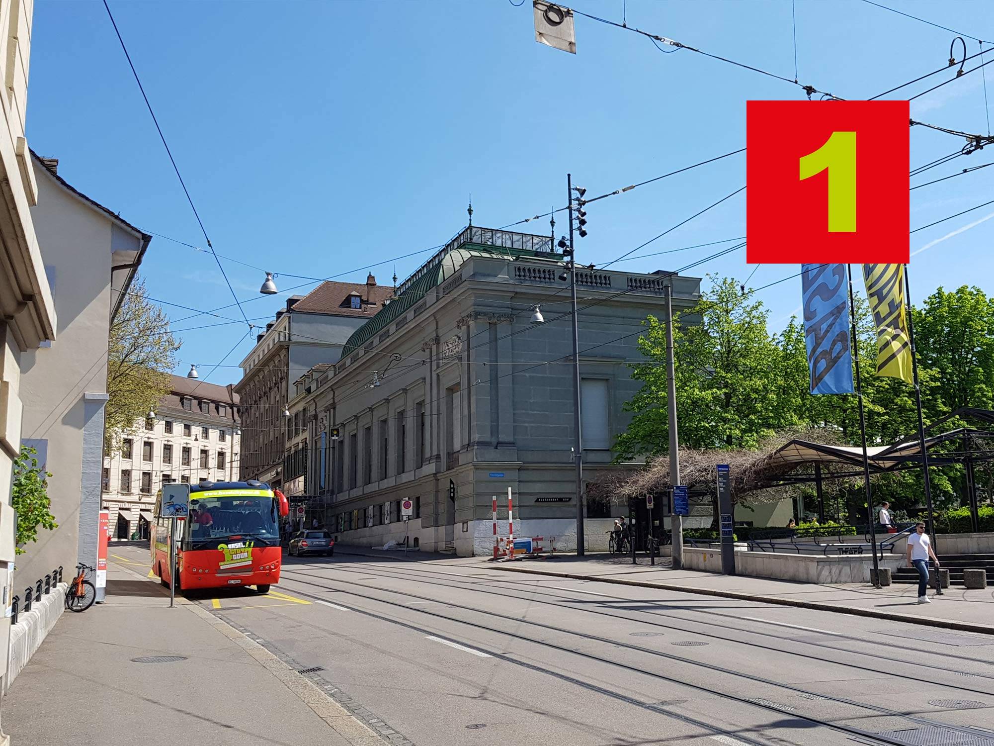 Haltestelle vis à vis vom Tinguely-Brunnen vor dem Stadtcasino auf Busparking. Höhe Steinenberg 7, Ecke Klostergasse